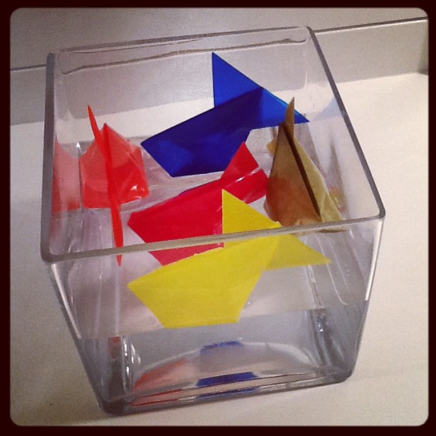 Day 110 – I thought I’d take it easy today and make a few origami fish with some color cellophane,…which is surprisingly difficult to fold. (Taken with instagram)