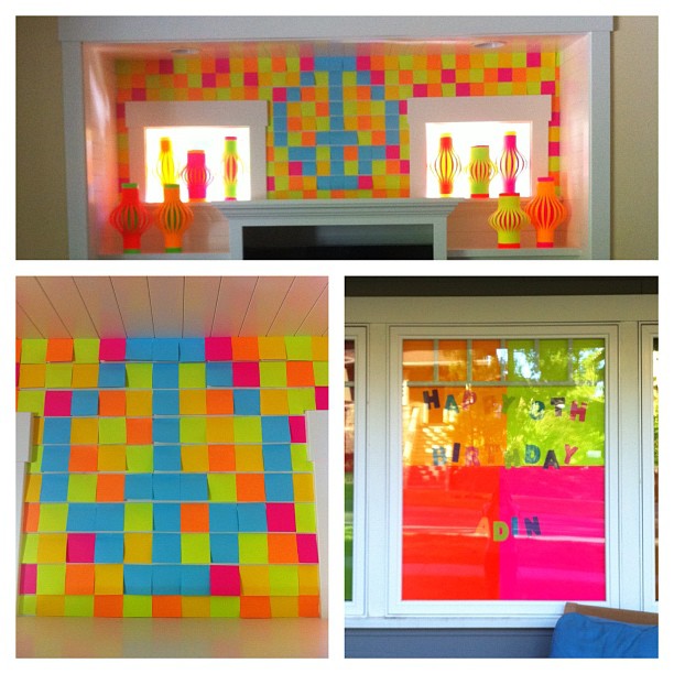 Day 157 – Remnants of the birthday party. Last minute decor ideas I am proud of – covering framed wall art with neon posterboard heart and peace sign cutouts, and covering the 8×10 area rug with a collage of bright colored faux fur pieces. Nope, I didn’t remember to photograph any of it. (Taken with Instagram)