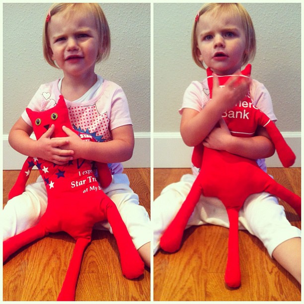 Day 252 – Floppy cat experiment is ongoing. The shape still isn’t right, but Stella says she loves it. After trying to take some pictures, she said the kitty cat was crying (too much posing.) so she soothed and hugged it until I promised I was finished taking pictures. (Taken with Instagram)