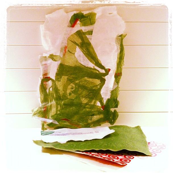 Day 261 – I made some fused plastic sheets by ironing plastic grocery bags between 2 layers of parchment paper. I’ll eventually use the sheets for a couple project ideas. Fused plastic used to be one of my favorite things to make and use, but lately I can’t seem to get the sheets to fuse properly. Folding them more and making thicker sheets seems to help, but they are still slightly warped. Anyway, instead of throwing away the cut off handles and bag bottoms as usual, I decided to pile them randomly and fuse them together. I love the abstract, random composition. Maybe I’ll frame it. (Taken with Instagram)