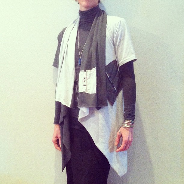 Day 296 – Constructed a wrap shirt from two XL t-shirts. One of my favorite parts of the process is stitching t-shirt scraps over the existing graphics.