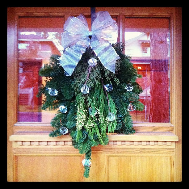 Day 322 – An alternative to the traditional wreath, I added acrylic gems and a silver bow to a simple swag of pine and juniper branches.