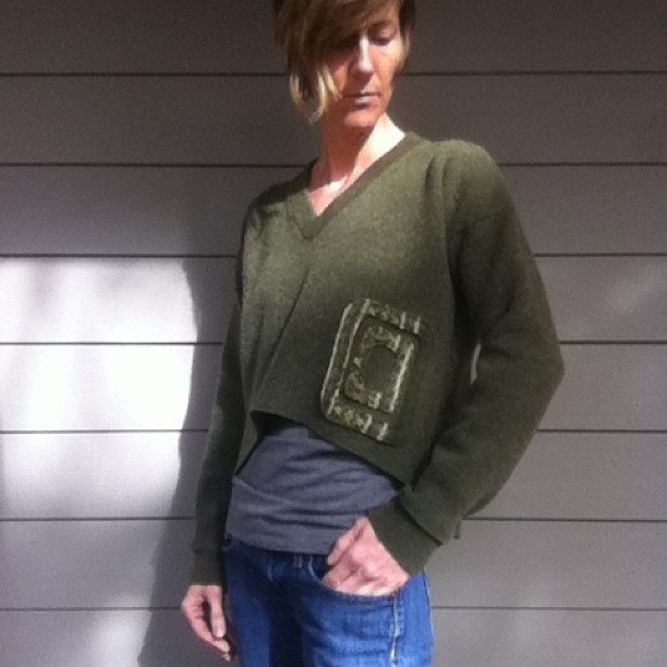 Back to altering felted sweaters. This one is cropped but scoops lower in back. I added second cuffs to the sleeves because I like mine really long. And of course I had to add the nested rectangles.
