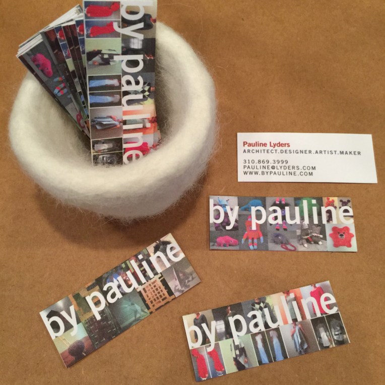 These are the little half-size business cards I whipped up for the artist market I participated in a couple weeks ago.  I created three different image backgrounds that showcase categories of things I make – Plicious clothing, art & decor, plush toys. Since my HP Officejet is unable to perfectly align double sided printing, I printed front and back on separate cardstock, glued them together, and then cut out the individual cards with a straight edge and X-Acto blade. Of course, if I had planned ahead, I could have just used Moo.com. They are the best on the web for business cards and other promo materials. But last-minute DIY just suits me better, of course.