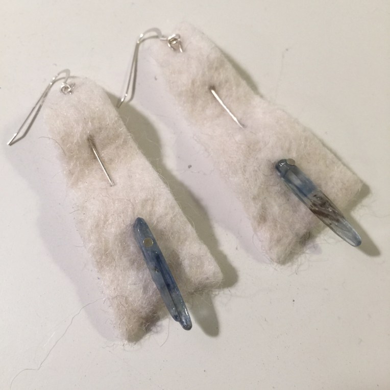 And about and hour later, I had two sets of felted earrings. The first set is made from simple, wet felted, gray alpaca wool balls that are strung onto bent jewelry headpins. The second set uses flat wet felt that is cut, hole punched, and strung onto a headpin. A piece of blue-gray kyanite anchors the headpin.