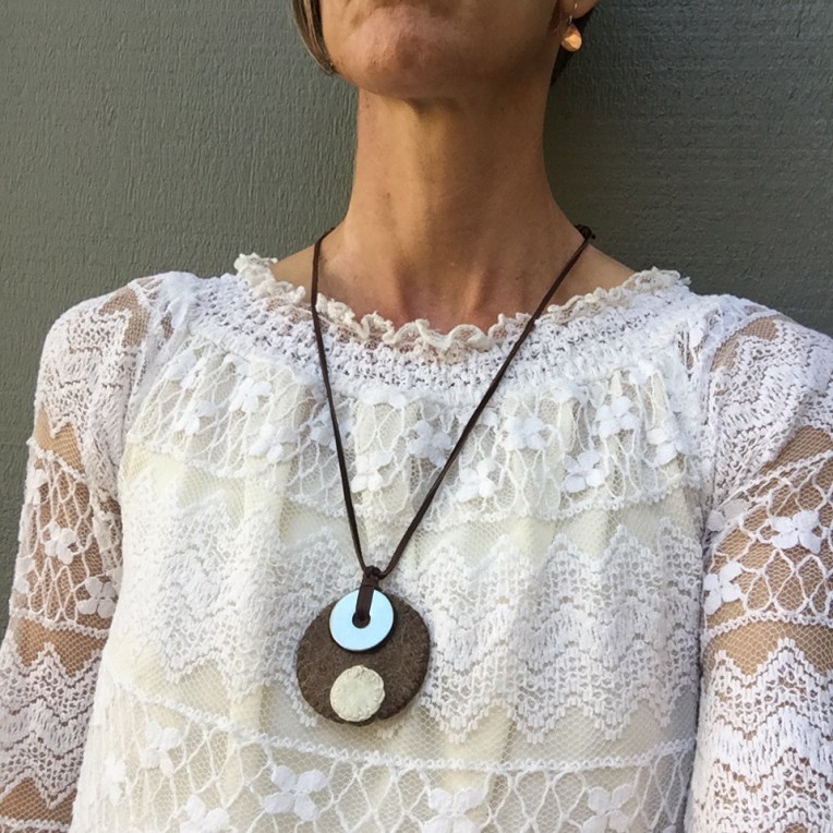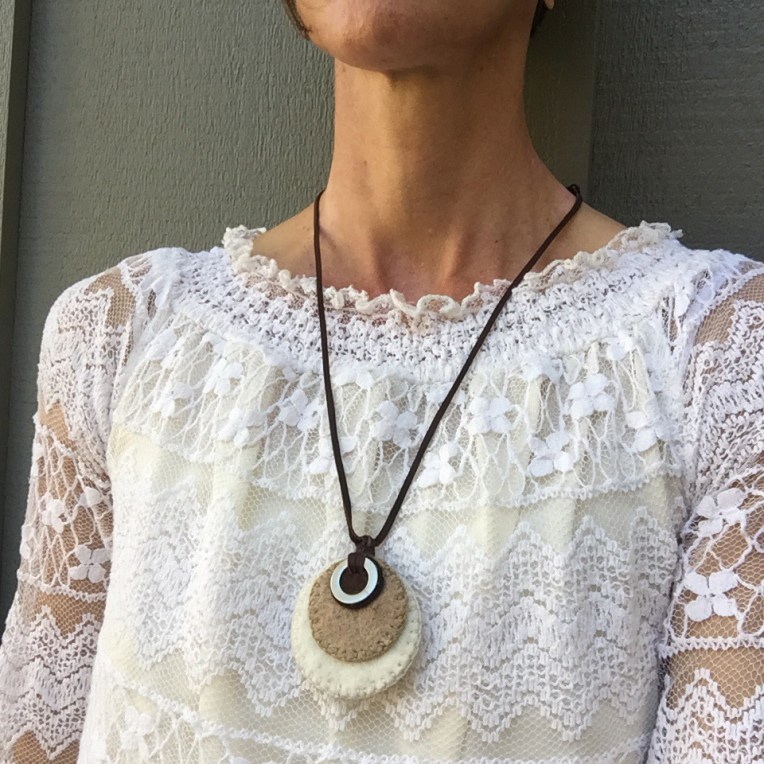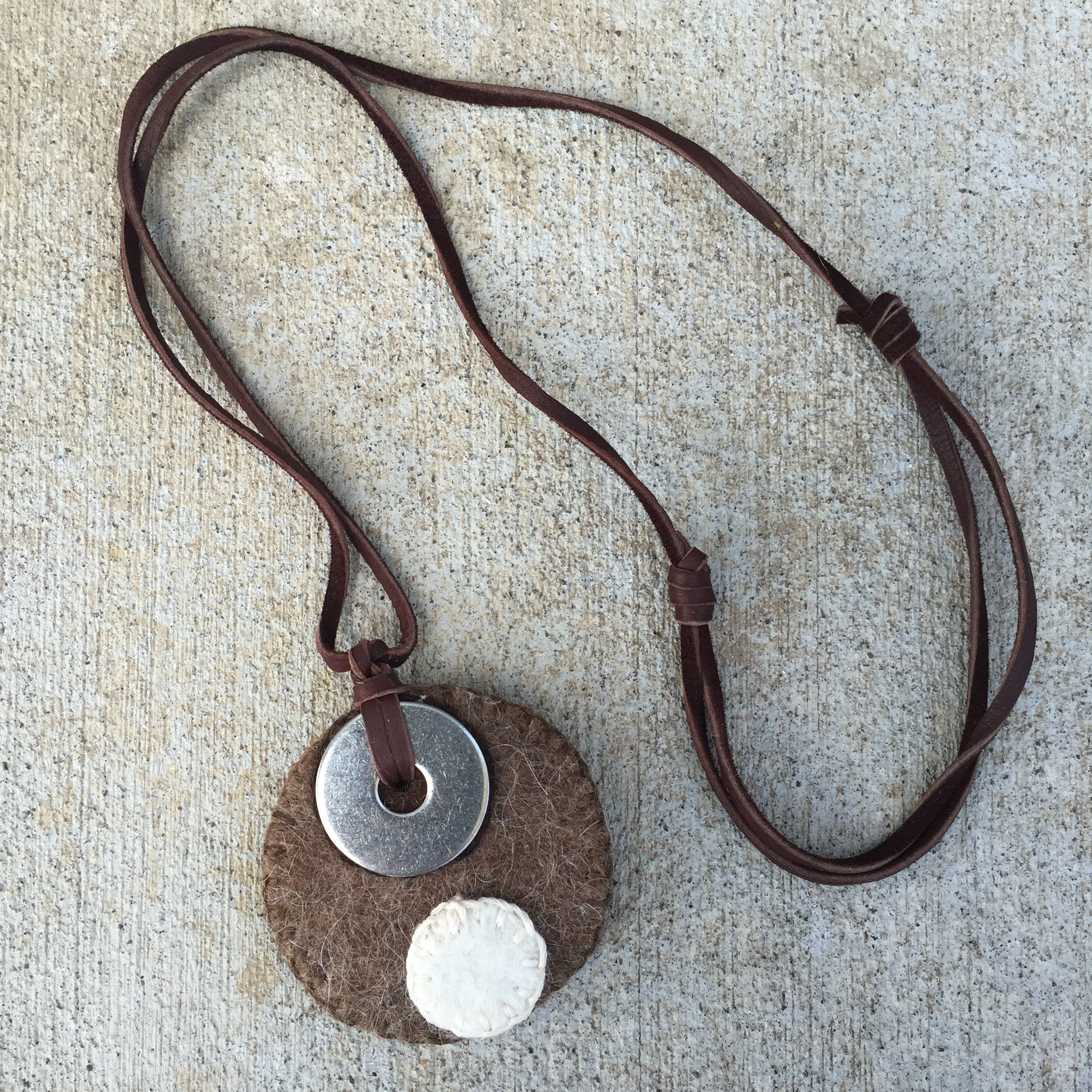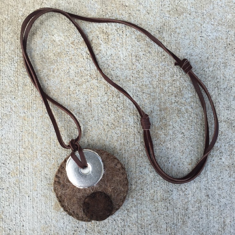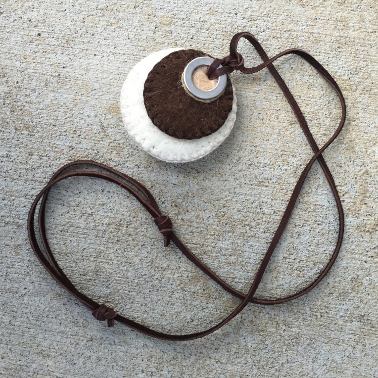 Finally we cut up an old, dark pink, wool sweater that we first felted by washing and drying hot. Felted wool can be cut without unraveling. We used a sewing machine to stitch around the edge with pink thread, filling the heart with polyester fill that we had saved from an old stuffed animal. “Love” was handstitched onto the heart with cream wool yarn.