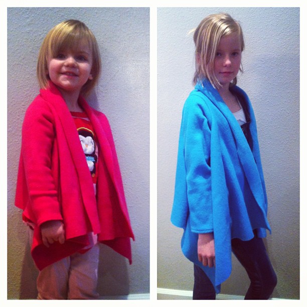 Several months ago I saw a fleece shawl sweater I liked that was a simple rectangle with arms. I decided to try to make one for each of my girls. They chose the color, pink and blue – no surprises there. Honestly, the design works for Stella’s size, but is a bit odd for Adin. Notice the expressions. It was torture convincing Adin to let me photograph her for my blog. Yep, Adin will never, ever wear it.