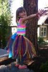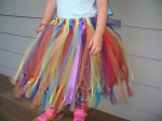 I usually try to make a handmade gift for my daughters on their birthdays, even though it is hard to compete with Lego and Barbie. But this rainbow tutu was worn with style and flair by the birthday girl on her special day. Since I wanted to emphasize the pattern of the rainbow, I cut one yard of tulle in each of the seven colors into four inch wide strips. The skirt was made using the “no-sew” method, or by tying individual strips onto an elastic waistband using a larks head knot. I did end up sewing the strips in place with a running stitch and adding a bright blue wide satin bow. More satin ribbons of varying widths, and in every color of the rainbow, adorn the length of the skirt.