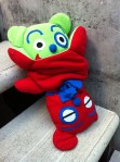 I’ve been working on an idea for a reversible bear for awhile now. This is my first prototype, made entirely by hand because I could not figure out how to sew it on my machine. I bought a rainbow assortment of t-shirts from Goodwill. Complementary colors, green and red, heighten the contrast between the awake bear and the asleep bear. As with all prototypes, there are several things that I would do differently next time. But for now, my 10 month old loves playing with this one.