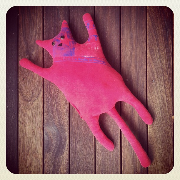 Day 249 – My floppy cat experiment (using a recycled t-shirt) is a challenge. The old t-shirt is too week for stuffing. The shape, as originally drawn, does not work in 3D. Weighted pellet are needed for to create the floppy effect. Onward. (Taken with Instagram)
