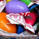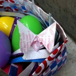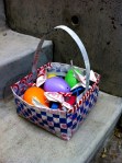 In celebration of Earth Day and Easter, my daughter and I made a basket of (yes, again) fused plastic. 1/2" strips are woven in and out of a slitted, 5-sided box base. Extra strips are used to fill the basket like grass. One more strip becomes the handle. I folded a few leftover squares into a hopping frog, a crane, and a butterfly. Did I ever mention how much I love origami?