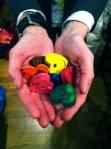 A few years ago, my daughter and I sorted through all of her crayons and put aside all of the broken ones to remelt into new blended crayons. This is an easy and fun craft to do with young kids. The crayons melt in a few minutes in a 250 degree oven. This time around, I sorted the crayons by color instead of mixing them into blends. I had the idea of making them all into necklaces, so I placed a cut straw into the still moist wax after taking it out of the oven. Once the wax was completely set, the hole was easy to pop out. A braided cord finished the necklace. I’m partial to the black crayon because it is minimal and less obviously a crayon.